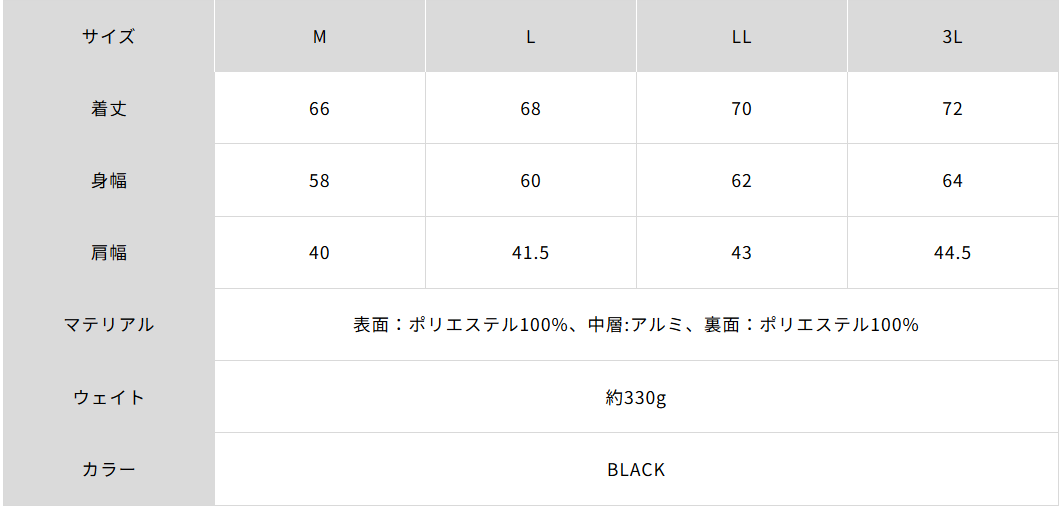 | 身幅 | 46 | 49 | 52 | 55 | 58 |